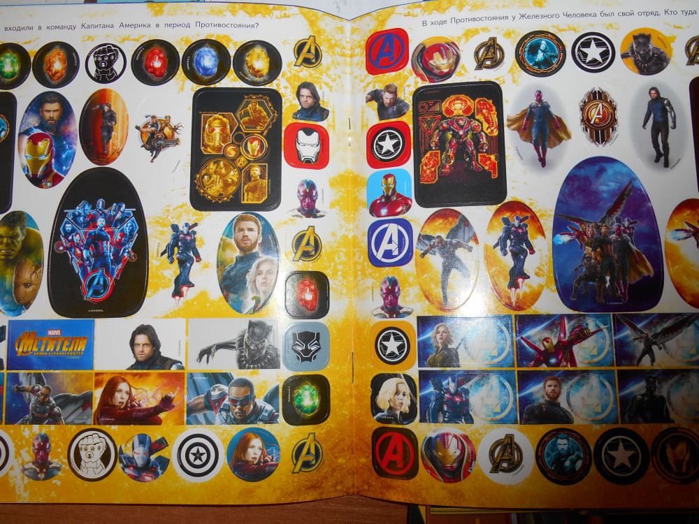 Наклеек много, все красивые и яркие. Даже жалко их куда-то использовать. В целом, меня всё устраивает, здорово. Но есть некоторый изъян... к сожалению, много одинаковых наклеек, они отличаются в основном по размеру или форме. А так стандартно взяты все промо к Войне Бесконечности. Это немного обидно. Для меня ВБ - это кульминация всех фильмов, мне казалось, что необходимо было собрать самые сочные кадры и моменты из всех имеющихся фильмов Марвел и напечатать. А так получается, что даже Локи нигде нет... ужасно обидно. И моего любимого Квилла очень мало в данном альбоме. Мелькнул буквально пару раз, и то в шлеме. Но всё равно спасибо за работу, Flip
