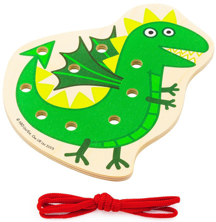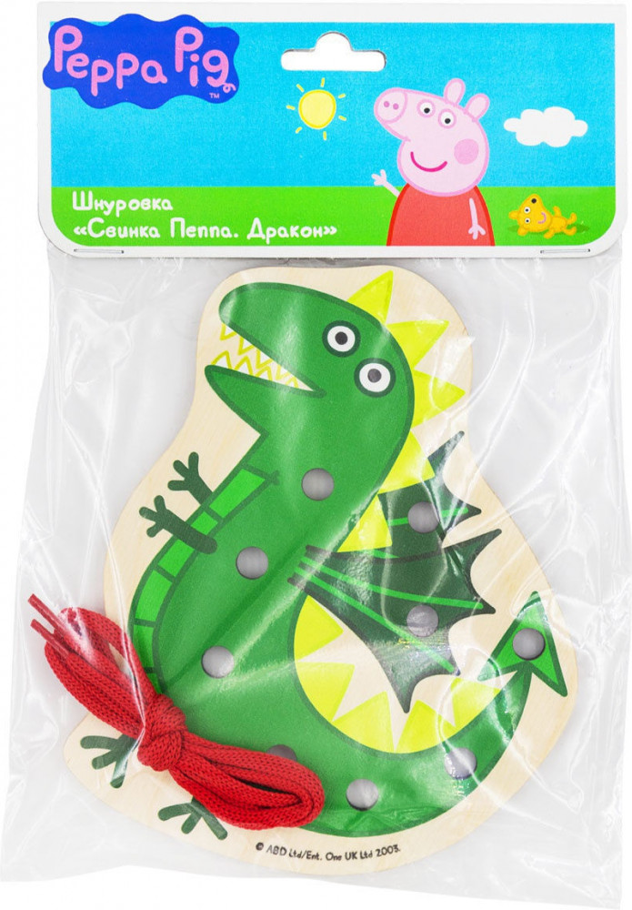 Шнуровка «Свинка Пеппа» представляет собой изображение персонажей мультфильма на деревянной панели. В игрушке есть отверстия, в которые нужно продевать шнурок. Шнурок есть в комплекте.