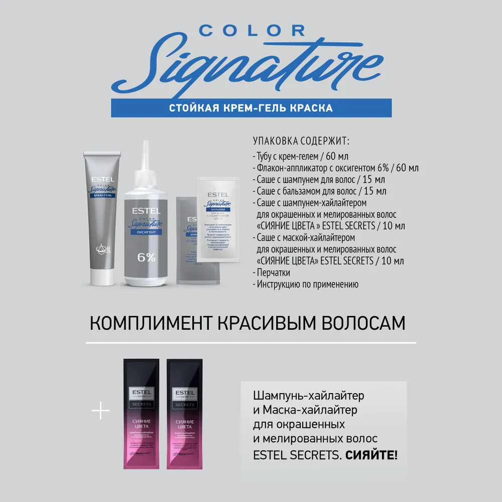 • заключительная обработка: по истечении времени окрашивания с помощью небольшого количества воды лёгкими массирующими движениями вспеньте краску. Тщательно промойте волосы большим количеством тёплой воды, пока она не станет прозрачной. Вымойте волосы шампунем «Стабилизатор цвета» Estel Color Signature. Нанесите на влажные волосы бальзам «Стабилизатор цвета» Estel Color Signature. Через 2–3 минуты смойте тёплой водой.