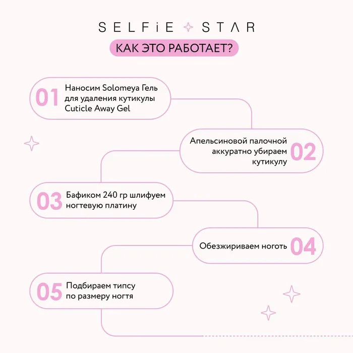Удаление накладных ногтей: Поочередно нанеси 2-3 капли жидкость для снятия искусственных покрытий под каждый ноготь. Дай средству время для воздействия и проникновения под ноготь. Начни процесс снятия с одного ногтя, используя маникюрную палочку, аккуратно подними край ногтя. Сними ноготь, осторожно двигаясь от края к основанию. Повтори эту процедуру для каждого ногтя, поочередно снимая их. Тщательно вымой руки. Обработай кутикулу маслом. Помни, что важно быть аккуратной и осторожной при снятии, чтобы избежать повреждения натуральных ногтей.