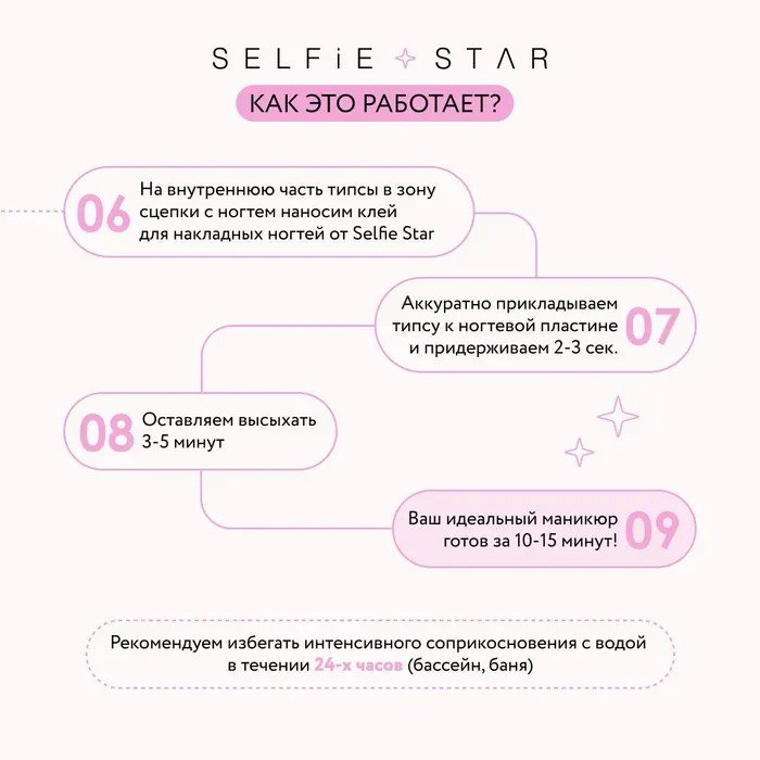 Способ применения: обработай ногти перед процедурой. Подбери размер накладных ногтей для каждого пальца. Накладной ноготь должен полностью закрывать натуральное ногтевое ложе. Расположи их в последовательном порядке. Нанеси небольшое количество клея (не входит в набор) на внутреннюю поверхность накладного ногтя. Приложи накладной ноготь с клеем на натуральный, и слегка прижми его на 10-15 секунд. Если излишки клея вышли из-под ногтя, удали их деревянной палочкой. Осторожно: Клей склеивается моментально. Будь осторожна. Если клей попал в глаза, промой теплой водой; при необходимости обратись к врачу.