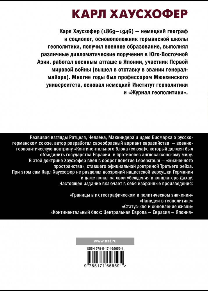 Развивая взгляды Ратцеля, Челлена, Маккиндера и идею Бисмарка о русско-германском союзе, автор разработал своеобразный вариант евразийства — военно-геополитическую доктрину «Континентального блока (союза)», который должен был объединить государства Евразии в противовес англосаксонскому миру. В этой доктрине Хаусхофер ввел в оборот понятие Lebensraum — «жизненного пространства», ставшего официальной доктриной Третьего рейха. При этом сам Карл Хаусхофер не разделял воззрений нацистской верхушки Германии и даже попал за свои убеждения в концлагерь Дахау.